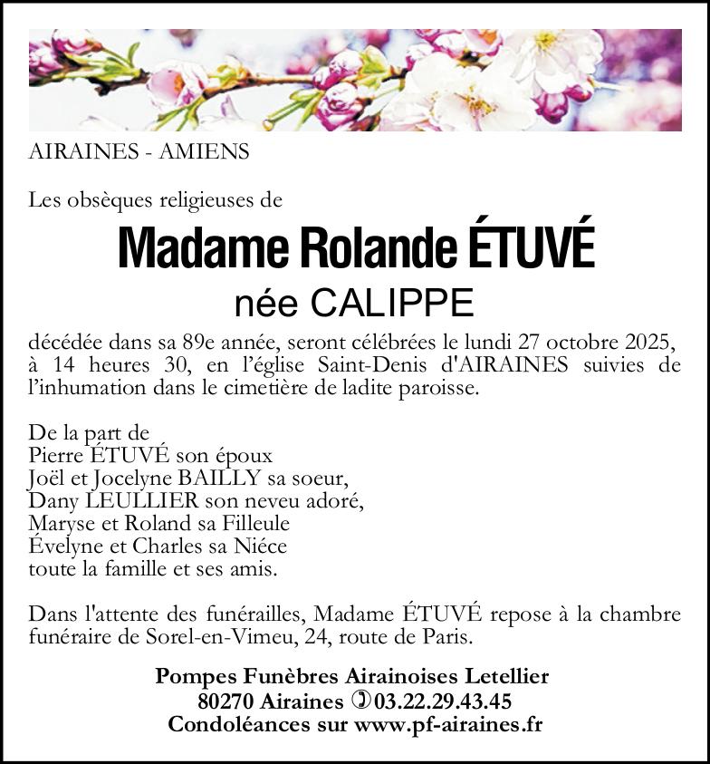 Avis de décès de Madame Rolande ÉTUVÉ née CALIPPE